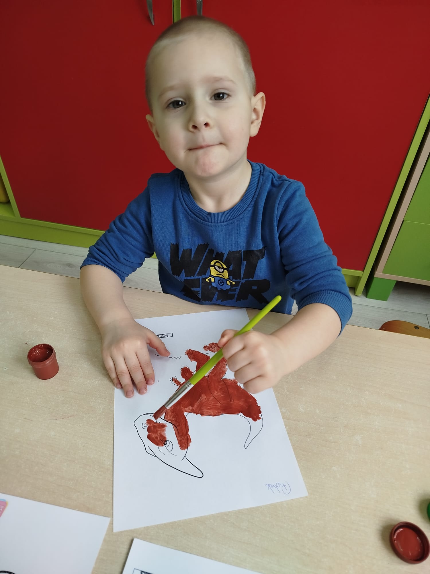 Nie zabrakło też twórczej zabawy – przedszkolaki malowały dinozaury farbami, tworząc kolorowe i wyjątkowe prace. Był również czas na swobodne zabawy figurkami dinozaurów oraz porównywanie ich wyglądu – dzieci sprawdzały, który dinozaur jest większy, który ma dłuższą szyję, a który najostrzejsze zęby.