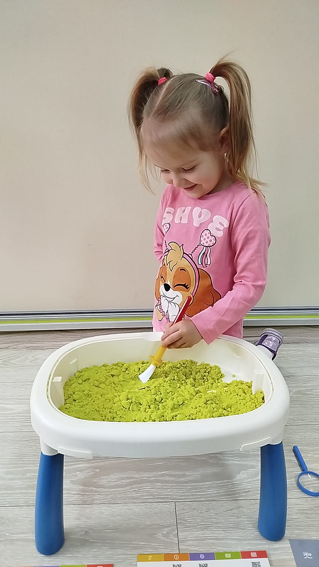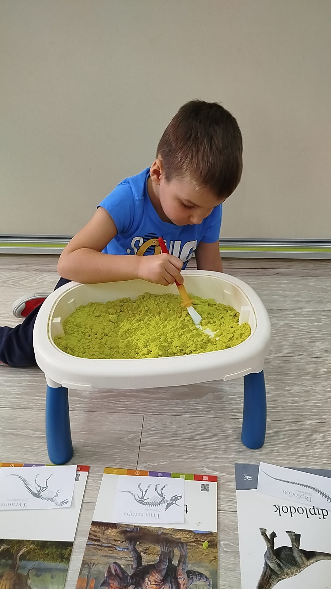 Dziś nasze maluchy przeniosły się w prehistoryczny świat dinozaurów. Podczas zajęć dzieci z wielkim zaangażowaniem szukały w piasku ukrytych szkieletów dinozaurów, odkrywając je niczym prawdziwi mali paleontolodzy.